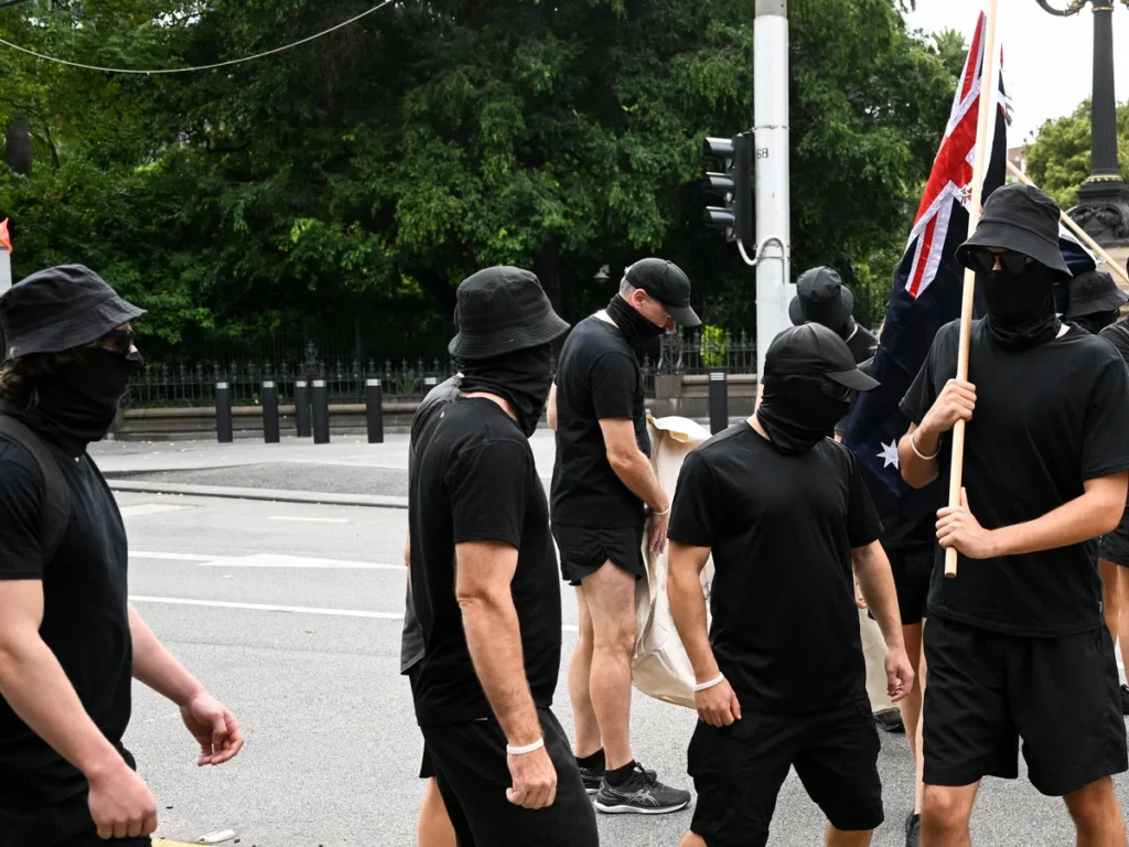 Image Neo-Nazi protesters outside Parliament House in Melbourne in March 2023. Photograph: James Ross/AAP